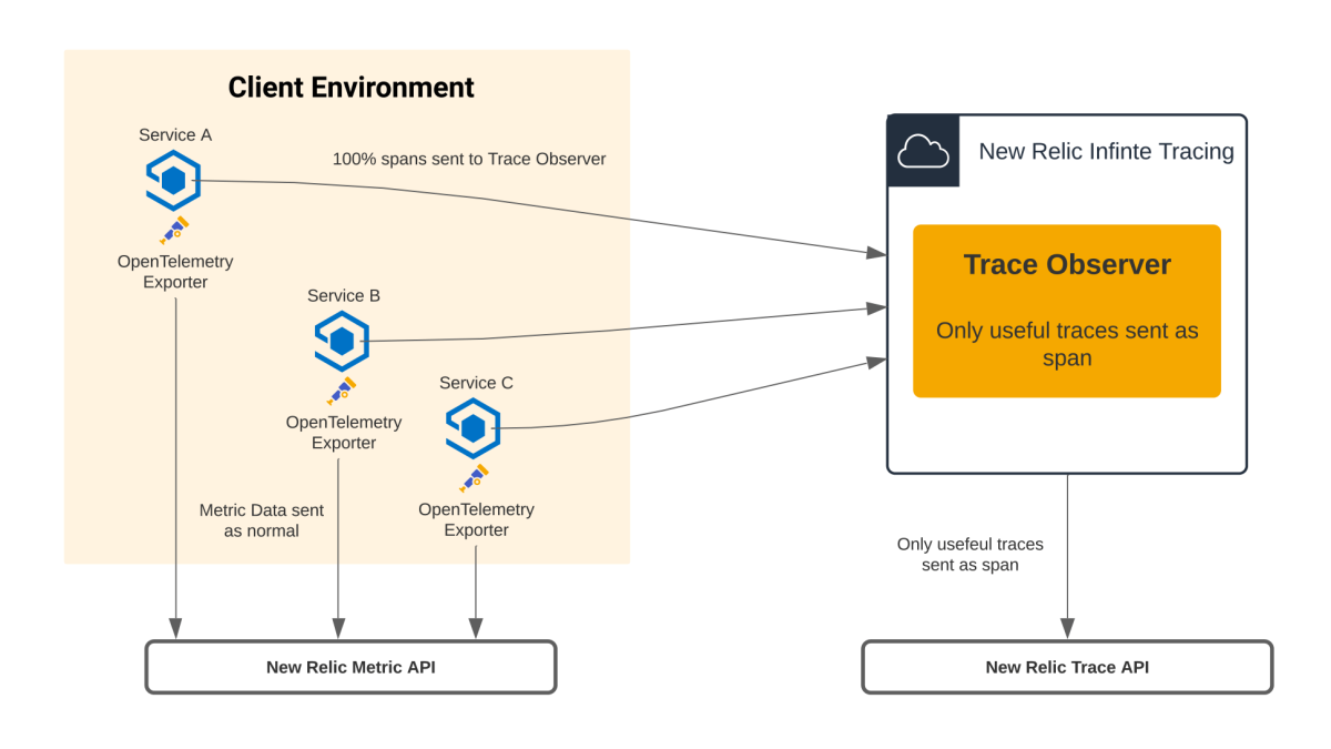 - New Relic Infinite Tracing: In addition to the previous options, with New Relic as your backend, you have the option to enable tail-based sampling using New Relic Infinite Tracing. This fully managed, distributed tracing service observes 100% of the application traces. After configured, it automatically samples the traces. Since there’s no infrastructure to manage, you don’t need to staff or operate the service for on-demand scalability.