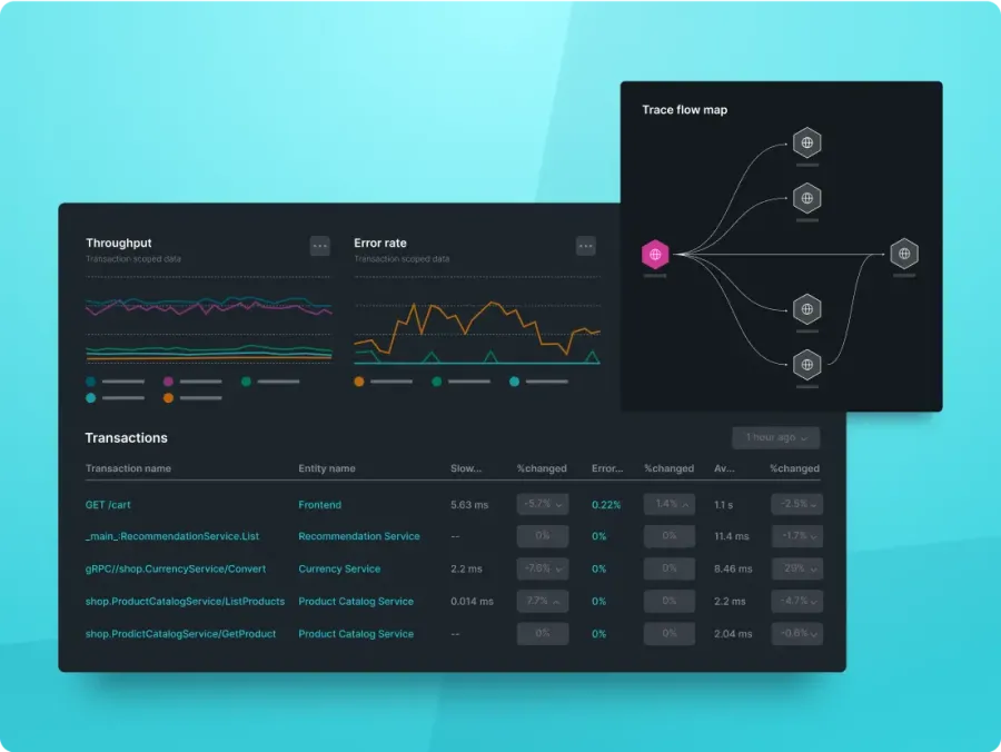Metrics | Page and element load times User on-page time Page-load errors Transaction times Single-page application performance (SPA) Golden signals (latency, traffic, errors, saturation) JavaScript errors End-user information (browser, device, OS, geolocation) | Response time Resource usage Throughput Latency Error rate Request rate Application availability (uptime) CPU usage Application performance index (Apdex) score Service level agreement (SLA) score |