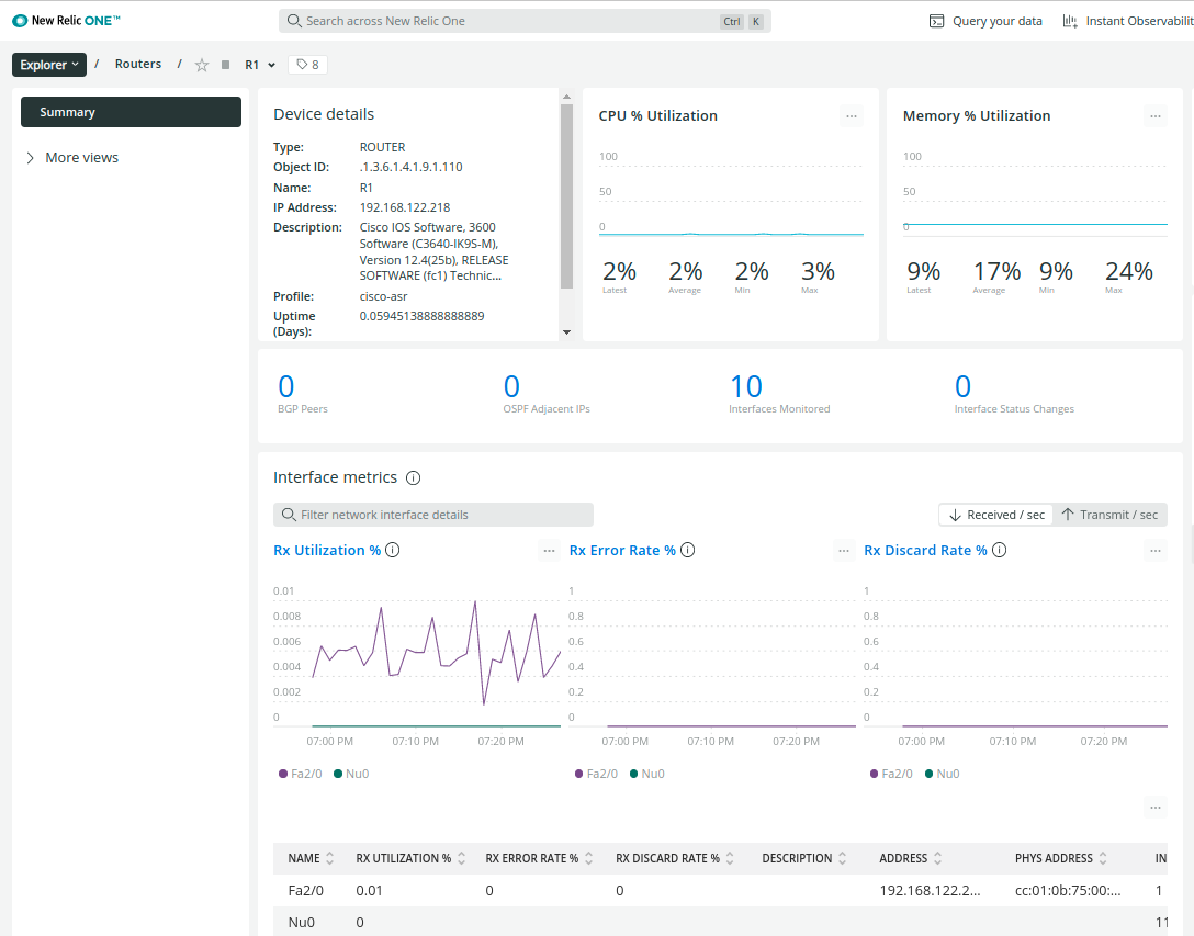 At this point, New Relic will be monitoring your devices and your Routers dashboard in New Relic might look something like this. Note that it might take a minute (or fifteen) for data to show up. That delay is completely normal.