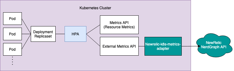 The metric adapter gets the metric value from the New Relic NerdGraph API based on a NRQL query and submits this value to the Kubernetes external metrics API. Then, the Horizontal Pod Autoscaler is ready to scale the deployments based on an external metric. The next graphic shows where the metrics adapter fits in.