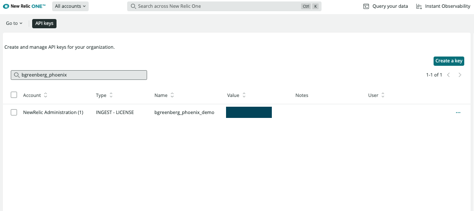 After you create an account, you can find your license key in the API keys setting of your new account. You need the license key to connect your application to your New Relic One account.