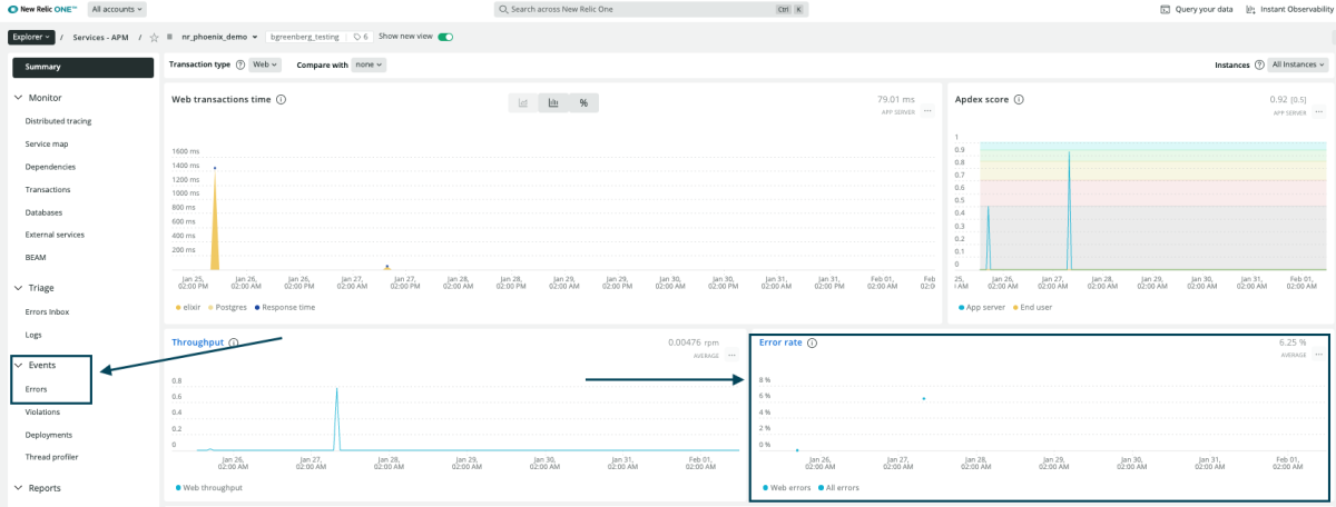 You can view the error from several different places in New Relic One. In the next screenshot, two possible paths are pointed out. One of them is through the Error rate visualization in the lower right corner, and the other is from the side navigation in the Events header.