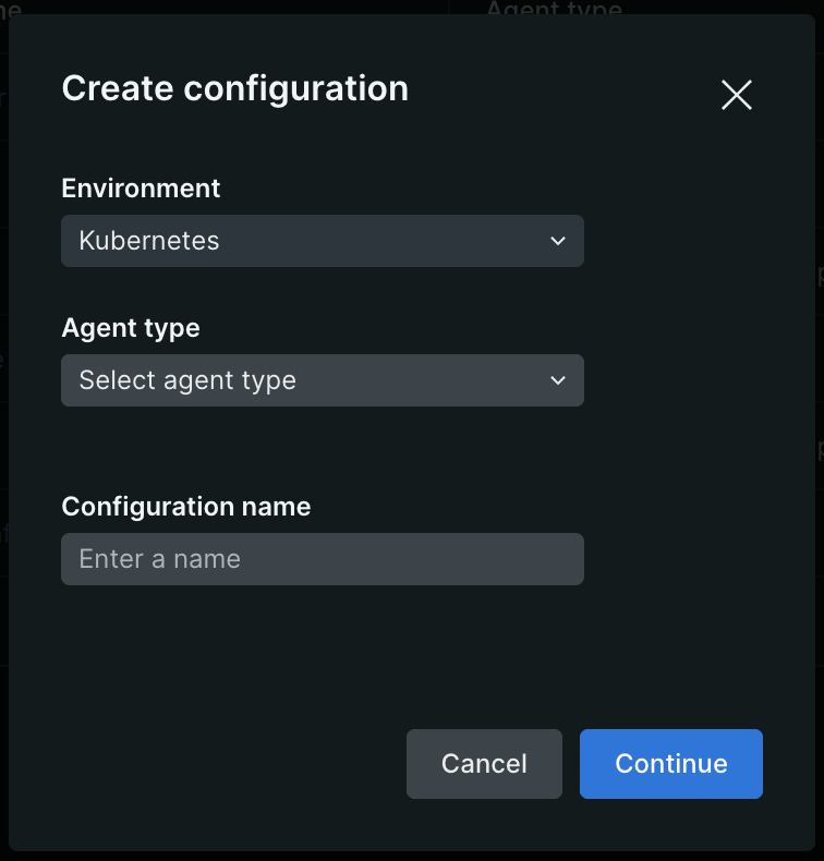 - Select Kubernetes as the Environment, the Agent type you’d like for your configuration, and add a name.