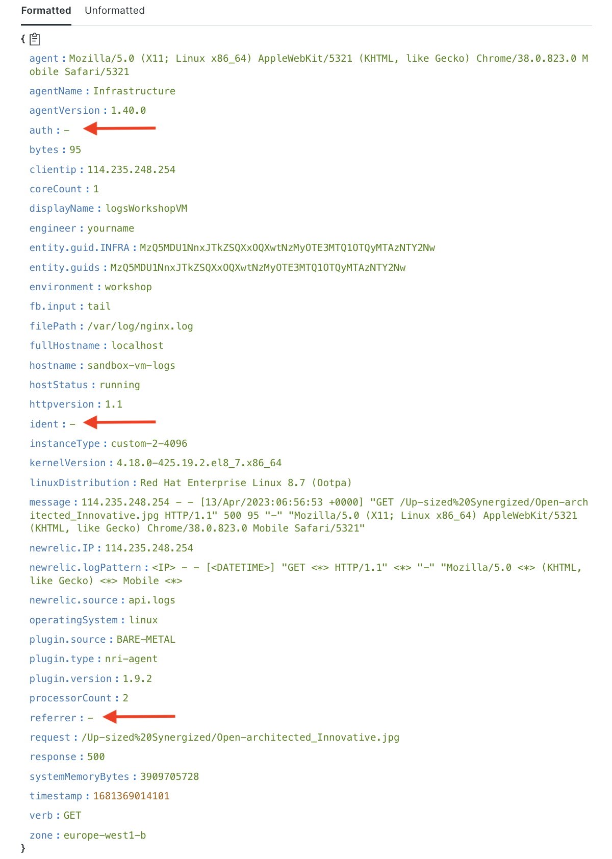 In the previous image, the attributes auth, ident, and referrer are recorded in New Relic before the drop filters are applied. These attributes can create unnecessary noise when dealing with many attributes or when the size of each log is huge.