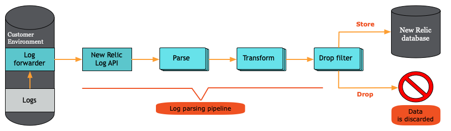 - Once log event data is sent to New Relic, it can be stored in our NRDB database or discarded. You can discard log data by creating drop filters using the logs management UI or GraphQL.