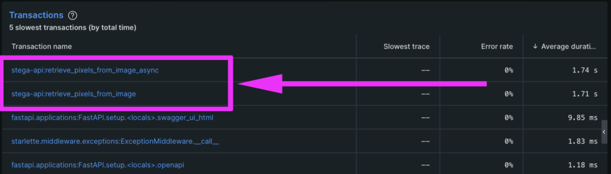 You can see just how long retrieving the image pixels took in New Relic. Revisit the summary page for your FastAPI service, and review the Transactions table.