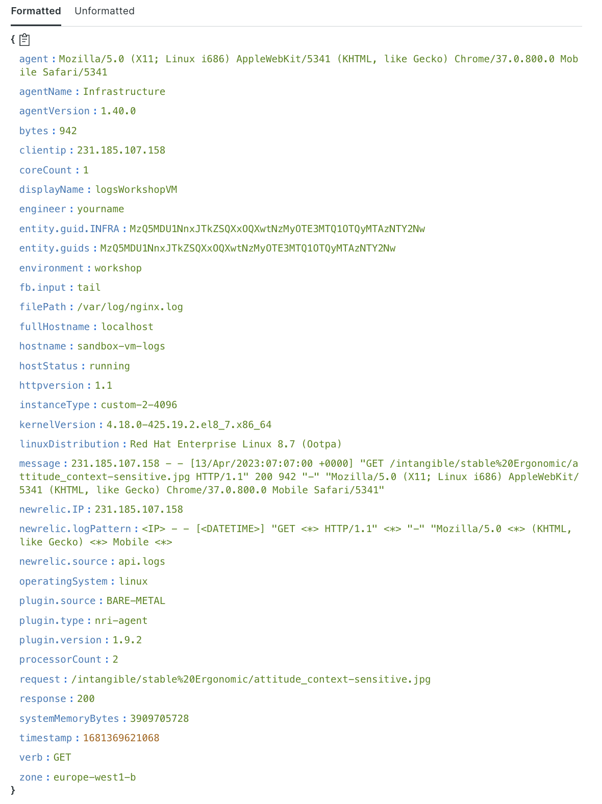 Below is an example of a log successfully parsed in New Relic.
