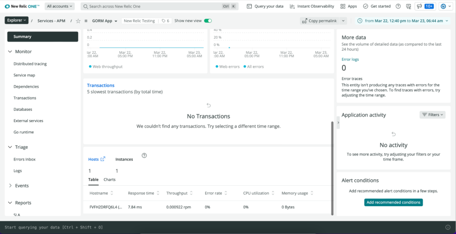 The New Relic Go agent automatically connects to New Relic, captures your transaction data, then sends it to New Relic. The application will output a URL in the application logs on your command line that takes you directly to your application data in New Relic. You can see the data from your application in this web UI.