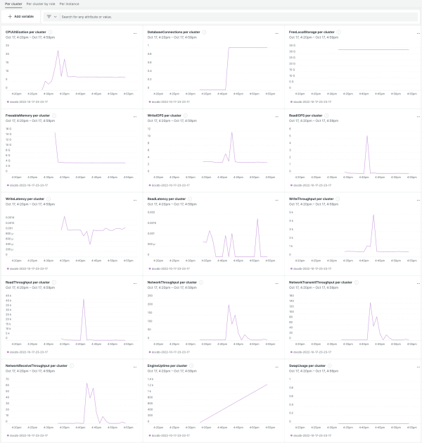 Amazon DocumentDB quickstart contains 1 dashboard. These interactive visualizations let you easily explore your data, understand context, and resolve problems faster.