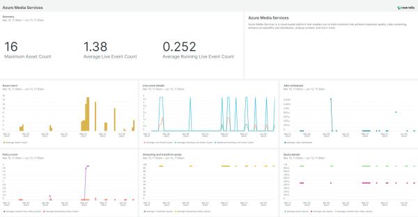 New Relic Azure Media Services monitoring quickstart empowers you to track the performance of Azure Media Services via different metrics including content key policy count, job quota, max running channels and live events count, streaming policy quota used percentage and more.