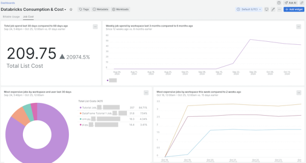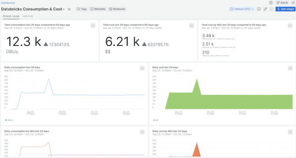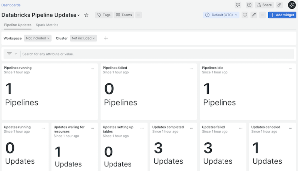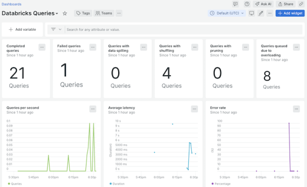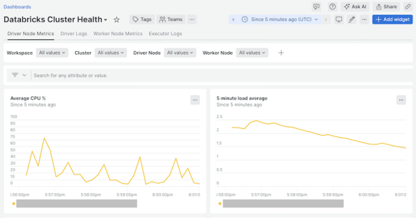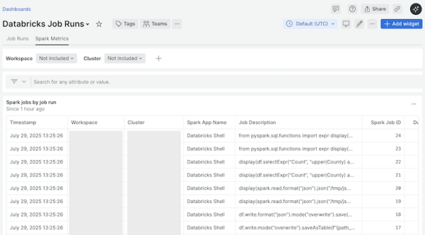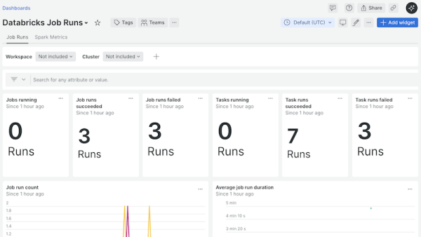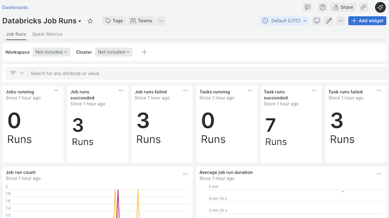 Databricks Integration quickstart contains 6 dashboards. These interactive visualizations let you easily explore your data, understand context, and resolve problems faster.