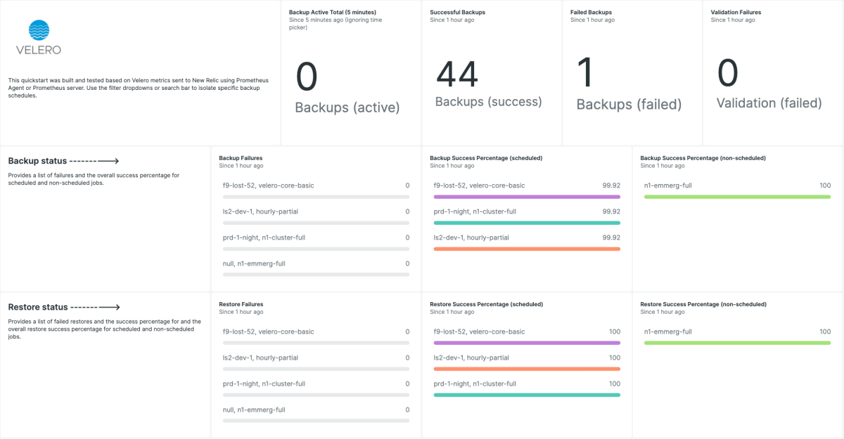 New Relic provides a Velero Quickstart which allows you to monitor your Velero schedules and jobs with ease.