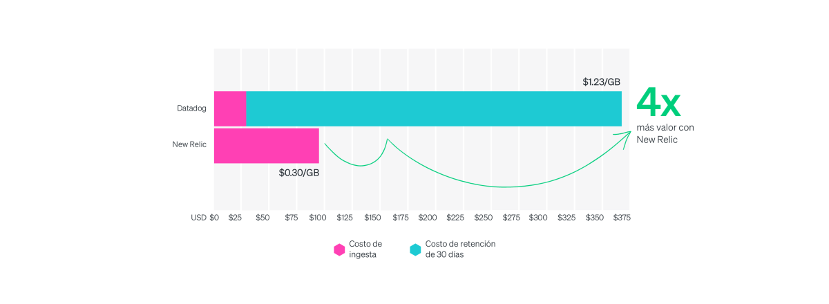 En cambio, los costos de datos de New Relic de US$0.30/GB ingerido incluyen hasta 30 días de retención, además de consultas, dashboards y más.