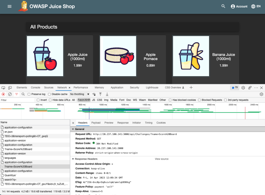 You can use APM to detect error rates, and an unusually high amount of errors is typically an indicator that something unexpected is happening within your application. For example, high error rates could be caused by hack bots trying to find open paths into an application. Using the OWASP Juice Shop example, if you use the developer tools in your browser to inspect the network activity, you’ll see a request to http://20.237.100.141:3000/api/Challenges/?name=Score%20Board.