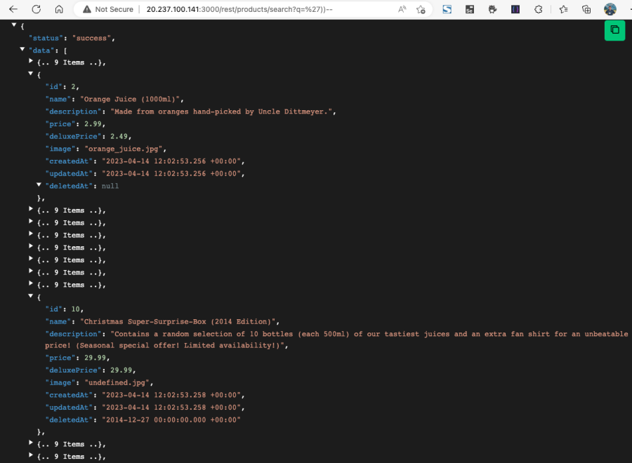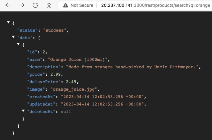 So it seems like you could potentially use this endpoint to retrieve product information. Indeed, you can run a request to http://20.237.100.141:3000/rest/products/search?q=orange to retrieve all products with the given search criteria.