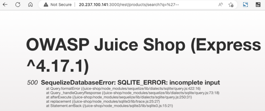 Play with this a little more and try using '-- as the search criteria. The entire request URL is now http://20.237.100.141:3000/rest/products/search?q='--.