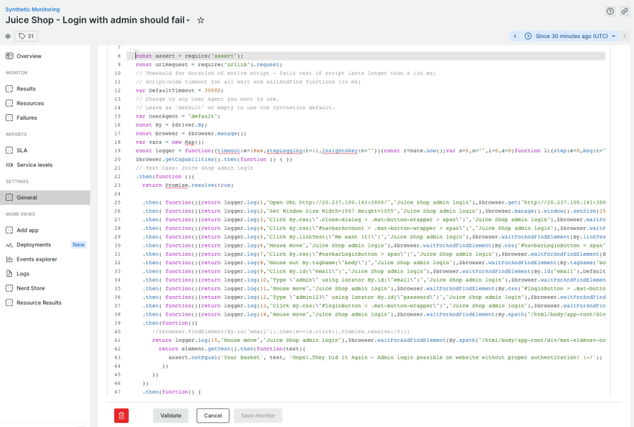 In the next image you'll see a synthetic check created with the New Relic scripted browser that accesses the application and tries to log in with some unsafe or hijacked admin credentials.