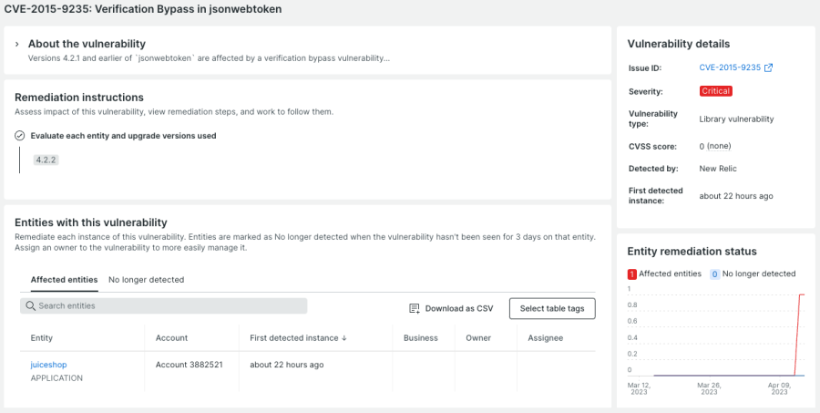 For example, if a library used by an application is found to have a known vulnerability, New Relic will alert you and provide information on the specific CVE, so you can update or patch the library as necessary to avoid potential security breaches.