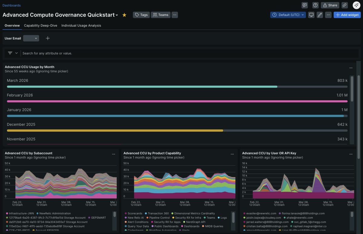 This quickstart provides a granular, diagnostic view of your consumption of advanced features in New Relic, specifically designed to decode how Advanced Compute Capacity Units (aCCUs) are distributed across your environment. It transforms raw billing data into actionable intelligence by mapping spend directly to specific user behaviors and technical configurations.