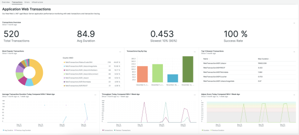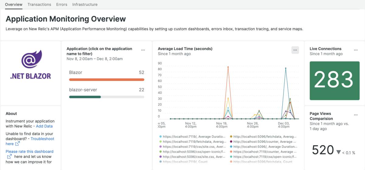 Microsoft developed Blazor Server to build web UIs with C#, HTML, and CSS. As a feature of ASP.NET, our Blazor Server integration with the .NET agent lets you monitor your apps with our quickstart dashboards right out of the box.