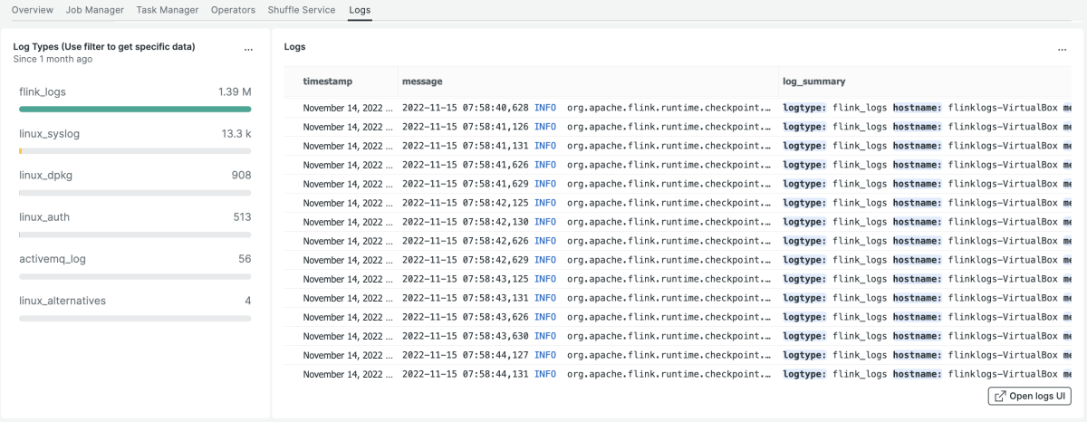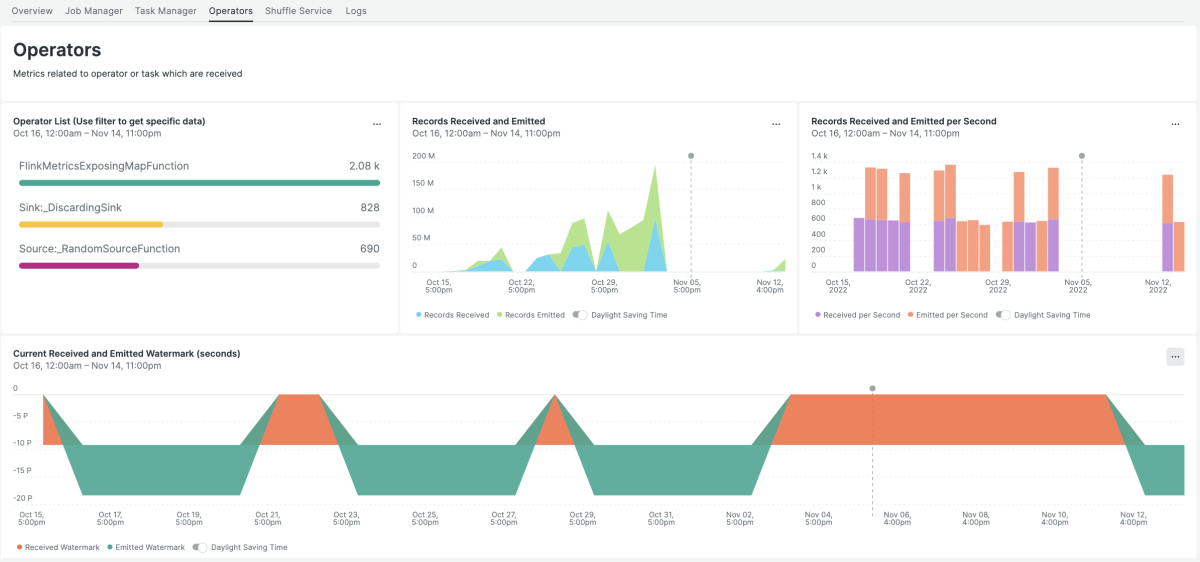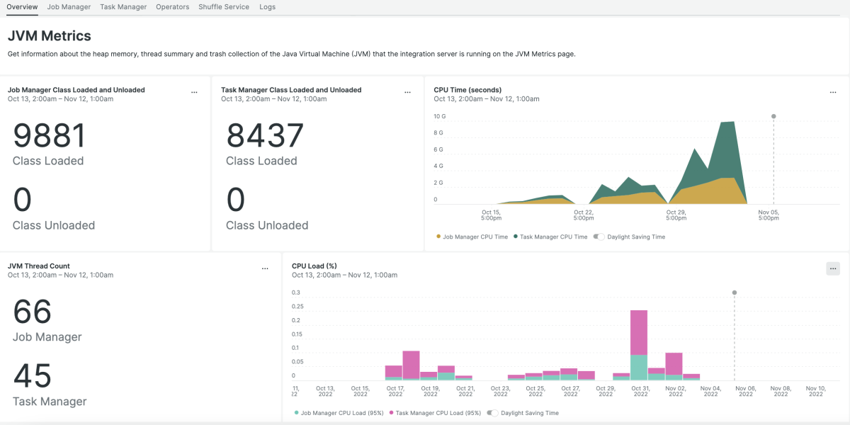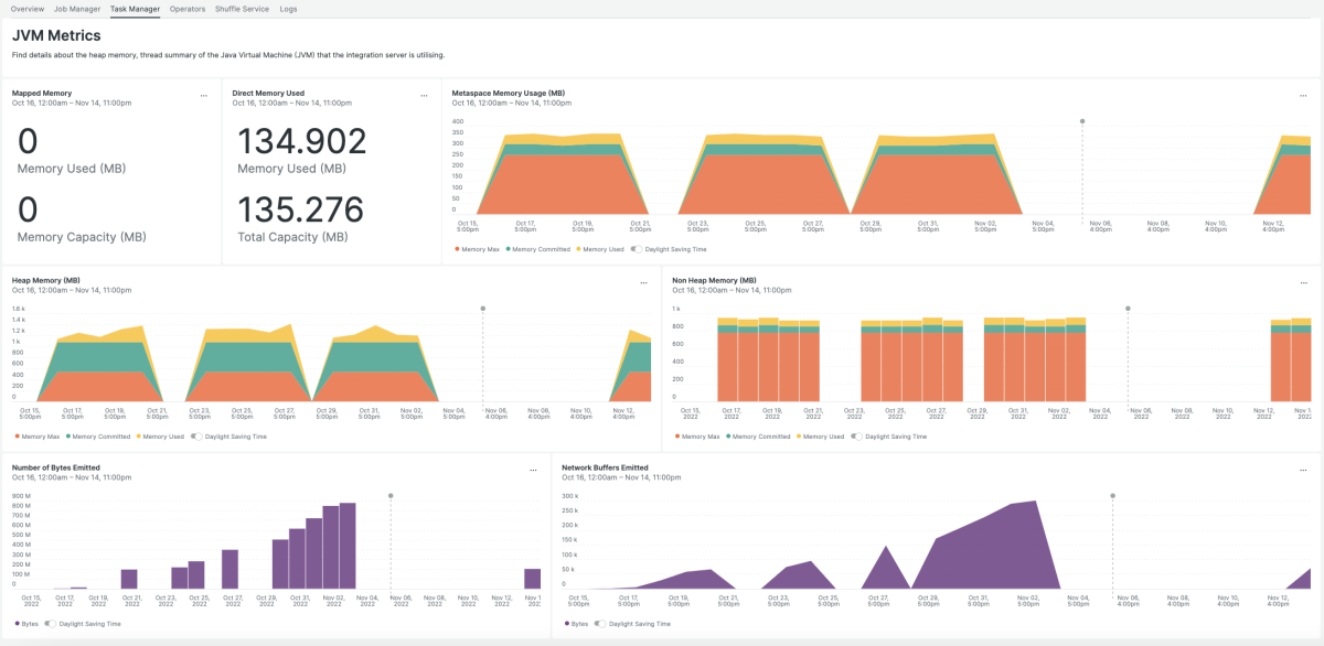New Relic detects your Apache Flink metrics like job manager (checkpoints, direct, mapped, metaspace memory usage), task manager (shuffle service, operators), heap memory usage and more.