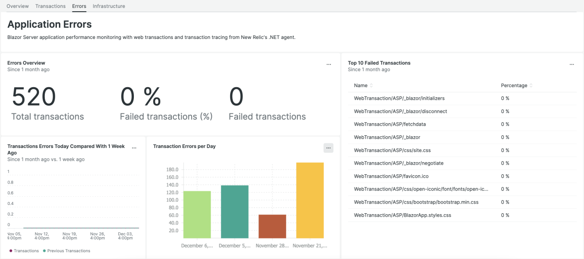 Microsoft developed Blazor Server to build web UIs with C#, HTML, and CSS. As a feature of ASP.NET, our Blazor Server integration with the .NET agent lets you monitor your apps with our quickstart dashboards right out of the box.