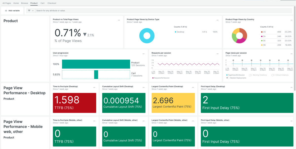 Customer Experience Quality Foundation quickstart contains 2 dashboards. These interactive visualizations let you easily explore your data, understand context, and resolve problems faster.