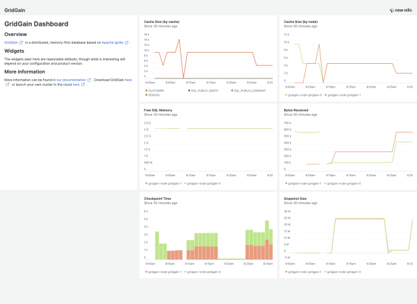 GridGain quickstart contains 1 dashboard. These interactive visualizations let you easily explore your data, understand context, and resolve problems faster.