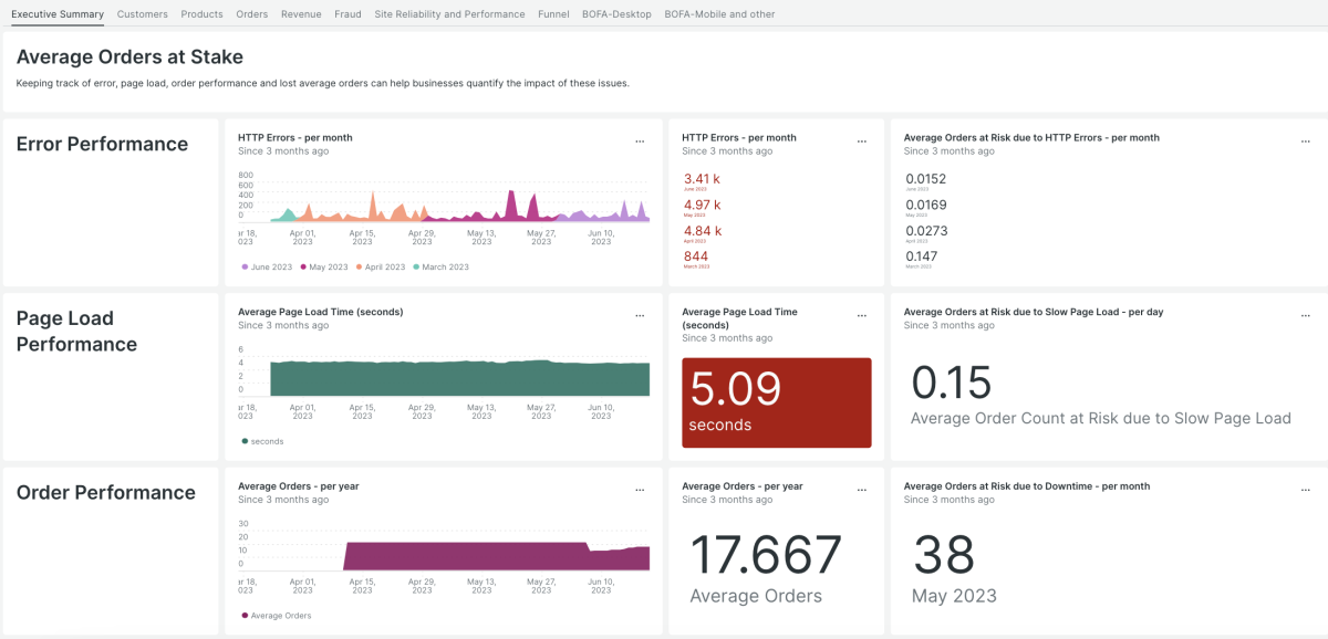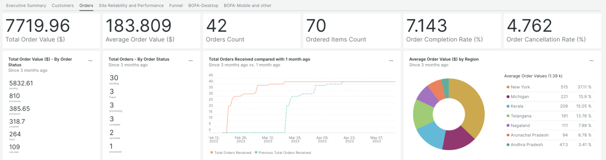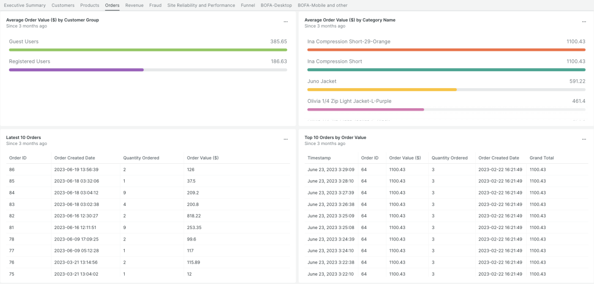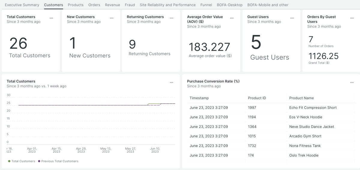 - Dashboards (Executive summary, Customers, Orders, Funnel and more)