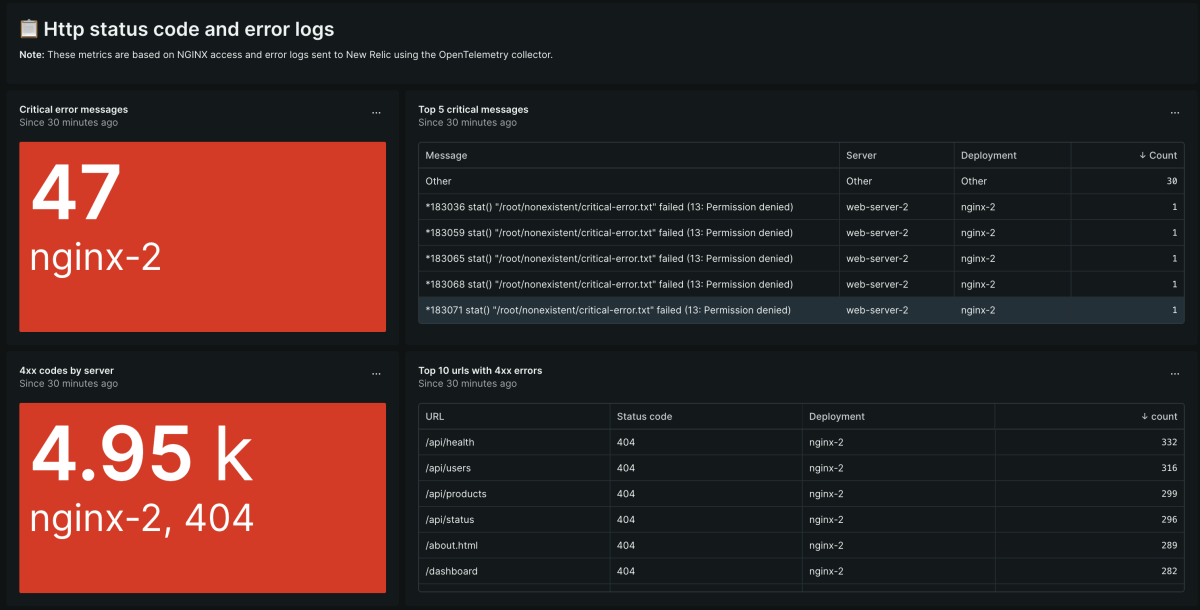 New Relic NGINX for OpenTelemetry quickstart gives you comprehensive visibility into your NGINX web servers alongside your apps and server infrastructure. Monitoring NGINX is vital to obtain real-time performance metrics for web servers across your entire environment. This ensures optimal server operations, leading to better application performance and enhanced user experiences.