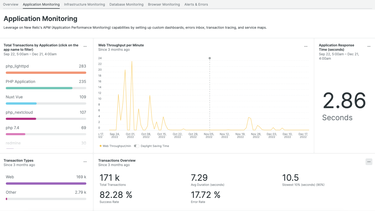 Leverage community expertise and instantly get value out of your telemetry data. This quickstart automatically instruments PDO with the New Relic PHP agent, and allows you to further leverage New Relic's APM capabilities by setting up custom dashboards, errors inbox, transaction tracing, and service maps.