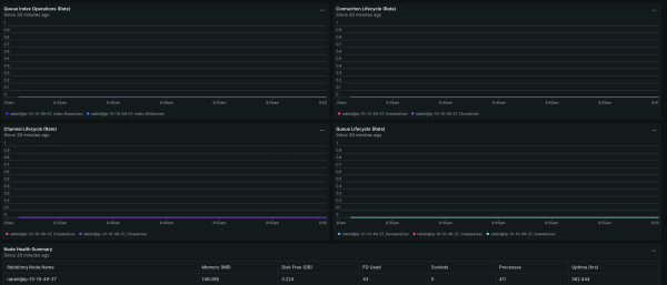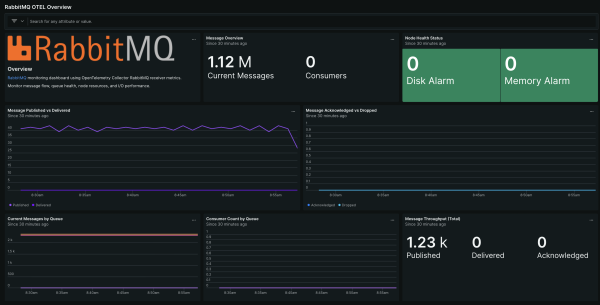 RabbitMQ (OpenTelemetry) quickstart contains 1 dashboard. These interactive visualizations let you easily explore your data, understand context, and resolve problems faster.