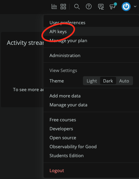 Clone the OpenTelemetry Collector with New Relic Exporter and spin up the Docker container, making sure to export the New Relic API key. To get a key, go to the New Relic one dashboard and choose API keys from the dropdown menu in the upper right.
