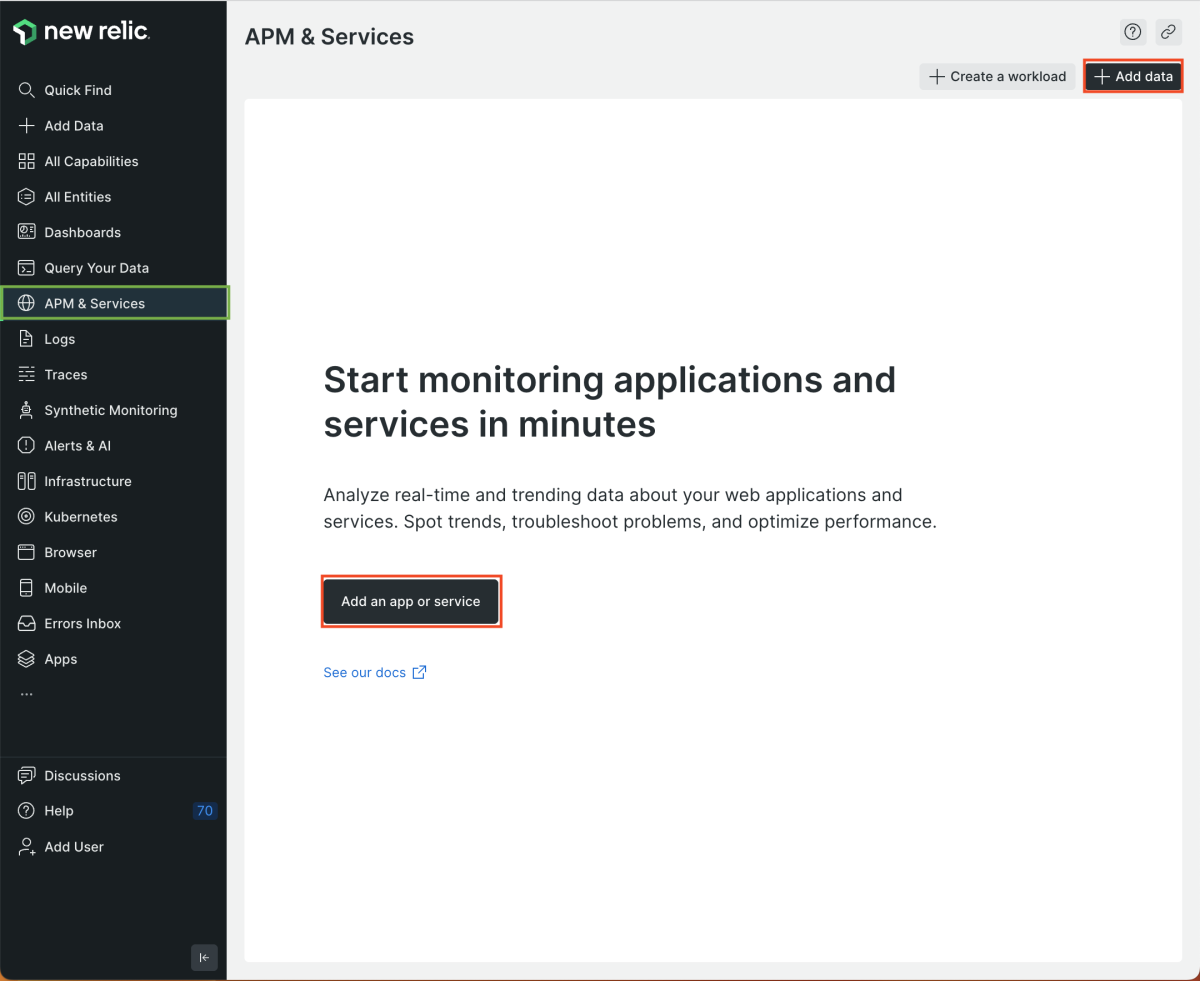 New Relic platform にログインし、APM & Services ページに遷移します。