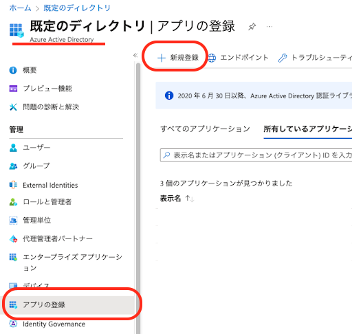(2)Azure Portal にサインインし、Azure Active Directory ->管理->アプリの登録->新規登録 をクリック