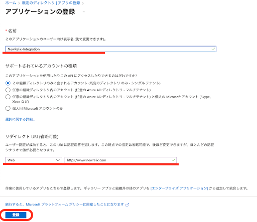 (3)任意の名前を設定し、リダイレクトURLに「Web」を選択し「https://www.newrelic.com」を入力し「登録」をクリック