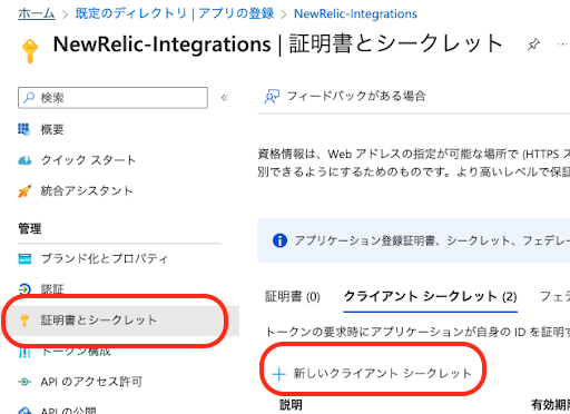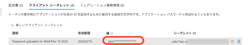(5)(3)で登録したアプリケーションの管理->証明書とシークレット->新しいクライアントシークレットを追加(有効期限は適切な日数に設定)