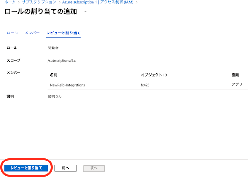 (9)ロールを閲覧者、メンバーに(3)で作成したアプリを追加し「レビューと割り当て」をクリック