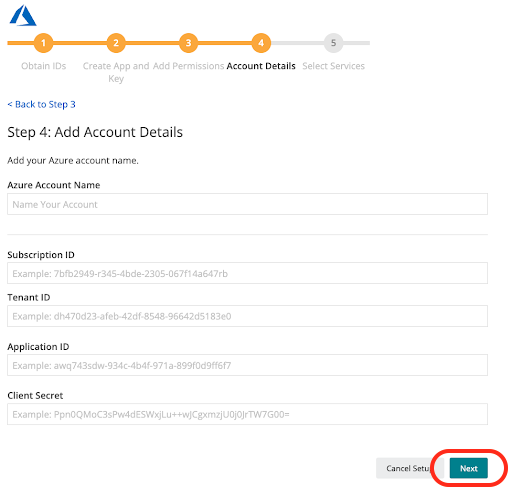 (4)Step4 まで進みAzure Account Name に任意の名前を設定し、前項Azure側で確認したSubscriptuion ID(1)、TenantID(1)、ApplicationID(4)、Client Secret(6)を記載し、Nextをクリック