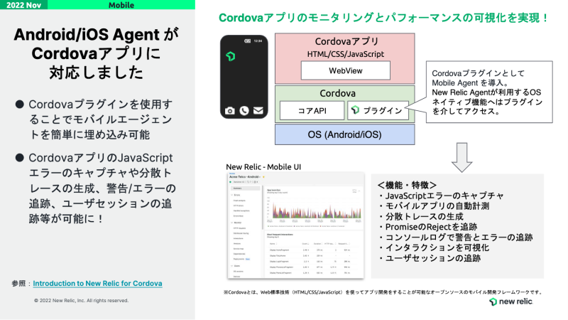 Cordovaアプリのエラーやパフォーマンスを計測するNew Relic Cordovaプラグインがリリースされました。当該プラグインを使用することでCordovaアプリへのモバイルエージェントを組み込みも簡単に行えます。