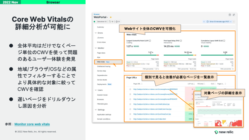 Browserの画面でサイト全体のCore Web Vitalsの数値を確認することは以前からできましたが、さらにページ毎に詳細な分析ができるようになりました。問題のあるページを即座に特定し、ドリルダウンして詳細分析して改善に繋げることができます。