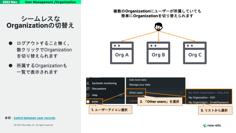 New Relicと複数のご契約がある場合やNew Relicを利用している複数の組織と関わりがある場合など、ユーザーが複数の組織(Organization)に所属している場合のログイン先の切り替えが簡単になりました。画面上から所属している組織が一覧で確認でき、選択することで切り替えることが可能になります。