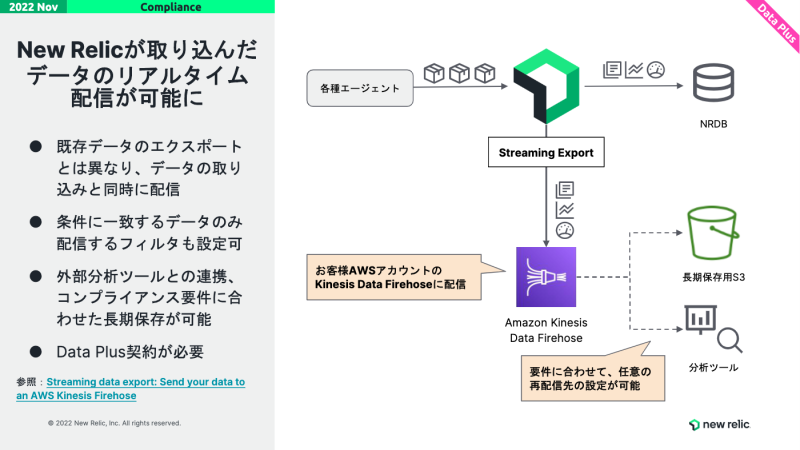 New Relicに取り込まれるデータをAmazon Kinesis Data Firehoseを使って別の場所にストリーミング配信できるようになりました。これによりコンプライアンス上長期保存が必要な場合や分析ツールでの活用などもできるようになります。なお、本機能を利用するためにはDataPlusプランのご契約が必要になります。