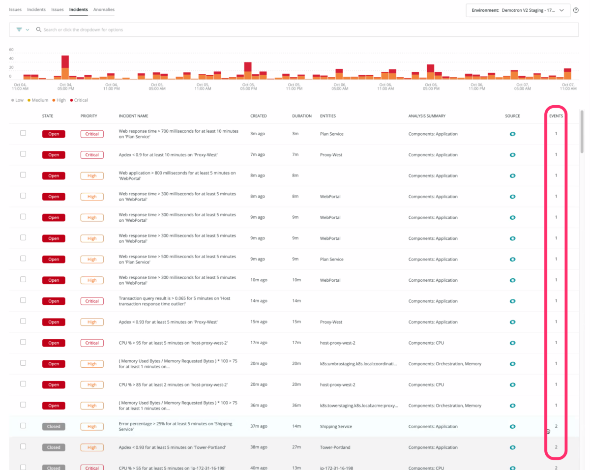例として、特定のエンティティの特定の症状についてNagiosから52の「インシデントが開かれた」イベントを取得した場合、New Relicは1つのインシデントを開くだけですが、「イベント」列には52のイベントが表示されます。