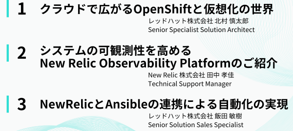 システム運用の自動化と効率化を目指す企業の情報システム部門およびシステムインテグレーターの方々を対象に、Red HatとNew Relicが提供する最新技術と活用方法について60分で解説するセミナーです。
