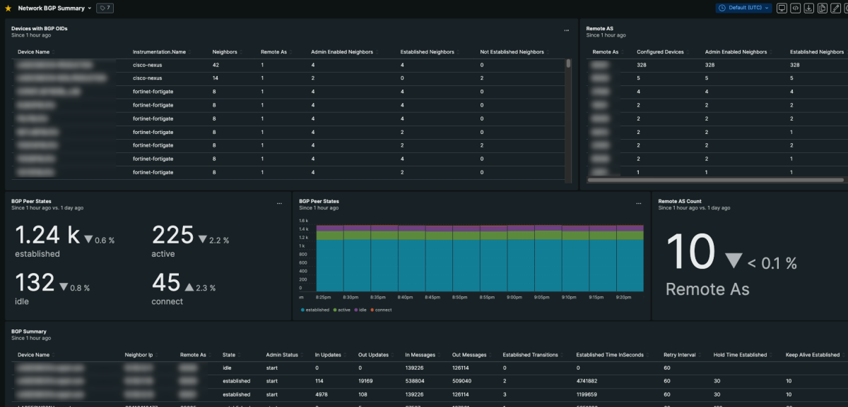 BGP Routing Neighbors quickstart contains 1 dashboard. These interactive visualizations let you easily explore your data, understand context, and resolve problems faster.