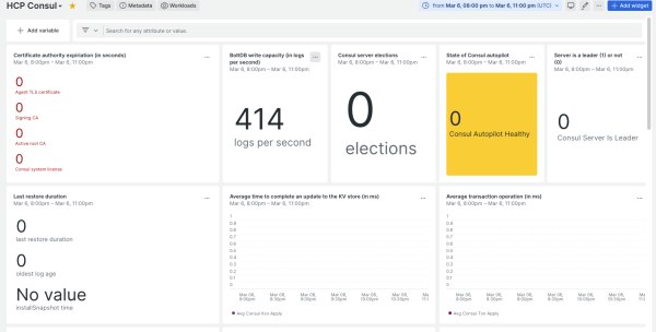 HCP Consul (OTeL collector) quickstart contains 1 dashboard. These interactive visualizations let you easily explore your data, understand context, and resolve problems faster.