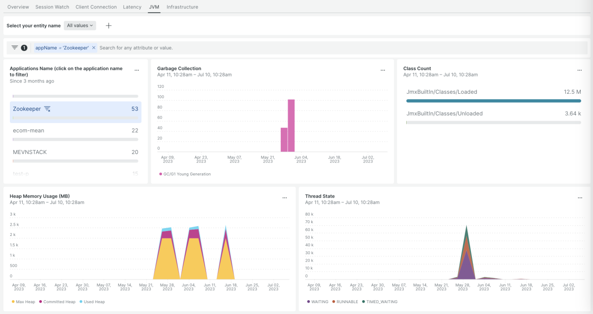 Apache ZooKeeper quickstart contains 1 dashboard. These interactive visualizations let you easily explore your data, understand context, and resolve problems faster.