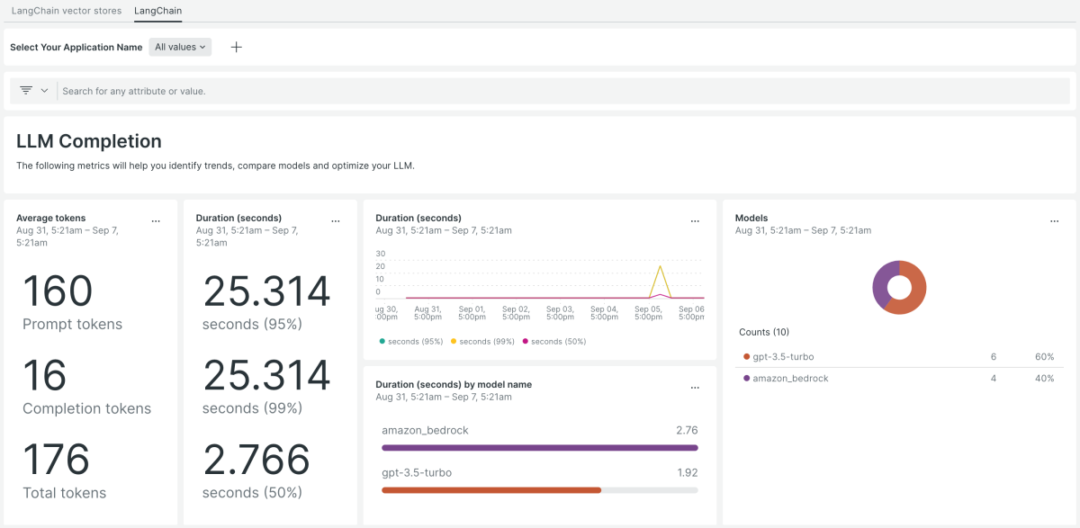 New Relic LangChain monitoring quickstart provides a variety of pre-built dashboards, which will help you gain insights into the health and performance of your LangChain app. These reports include: