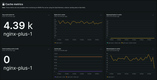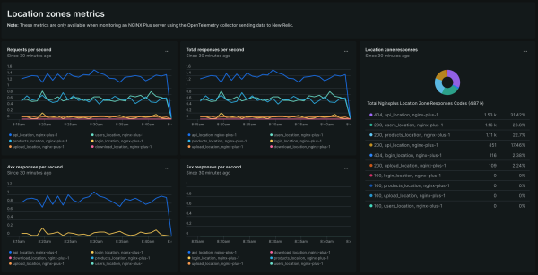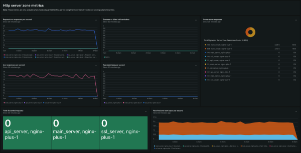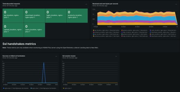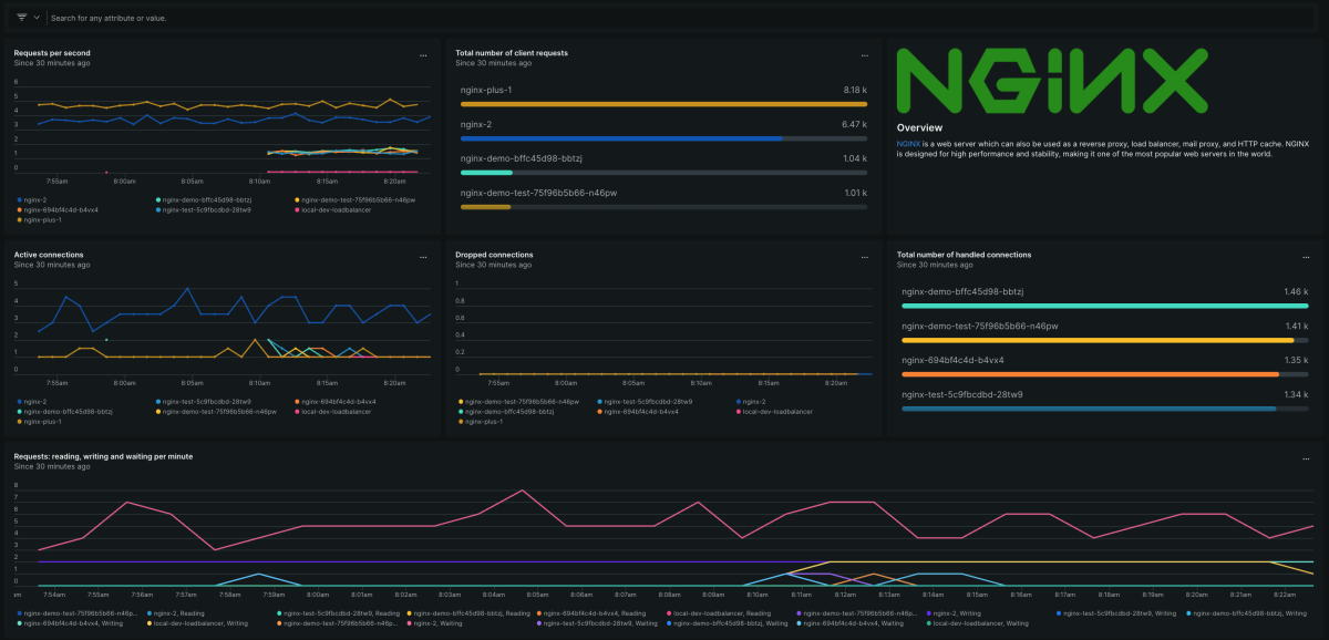 The OpenTelemetry nginxreceiver collects metrics from your running NGINX instances. These metrics provide insights into connections, requests, client errors, server errors, and more. A New Relic entity will be created for each NGINX instance, allowing you to easily explore, configure alerts, and compare metrics for all your NGINX servers in one place. Our monitoring quickstart includes a pre-built dashboard that displays aggregated metrics from all of your NGINX instances, with the ability to filter the data for specific analyses.